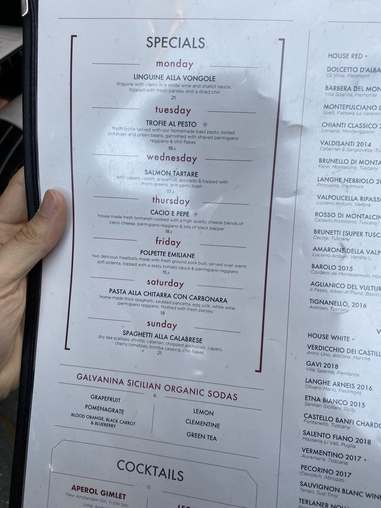 Goat and Ricotta cheese gnocchi tossed in D.O.P San Marzano tomato sauce, with fresh basil, and parmigiano reggiano